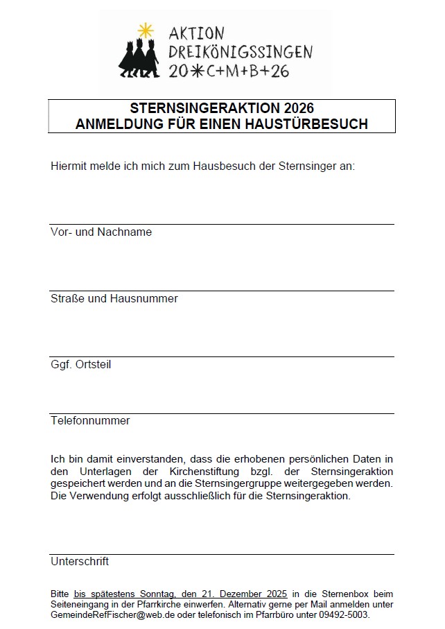 Wie auch im letzten Jahr kommen unsere Sternsinger in Parsberg nur nach Voranmeldung. Einfach das Formular unten ausdrucken, ausfüllen und in die aufgestellten Box in Sternform bis spätestens So 21.12.2025 beim Seiteneingang in der Pfarrkirche einwerfen.
